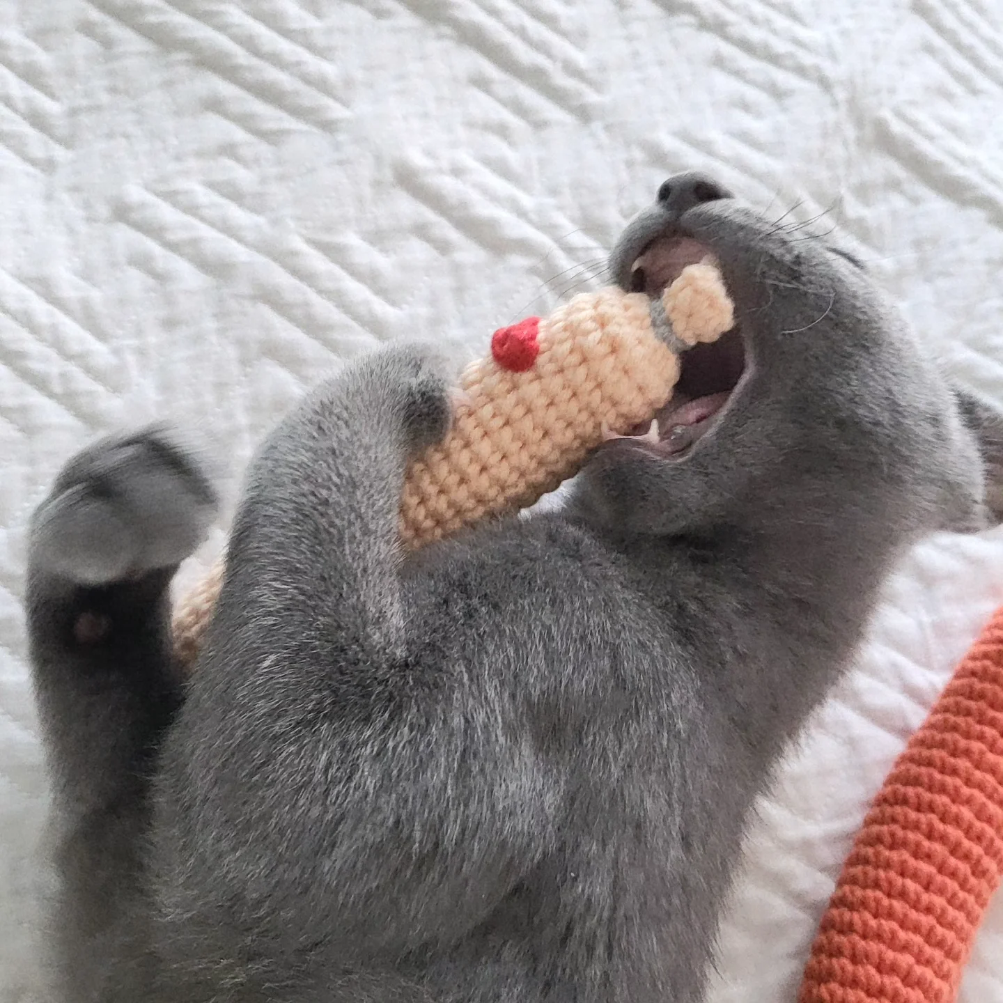 무더운 여름, 우리 집 회색 고양이가 새로운 장난감을 만나게 되었습니다. 하얀 무 몸통에 파릇파릇한 무청이 달린 뜨개질 장난감인데, 첫 만남부터 심상치 않더라고요. 초록빛 눈동자로...